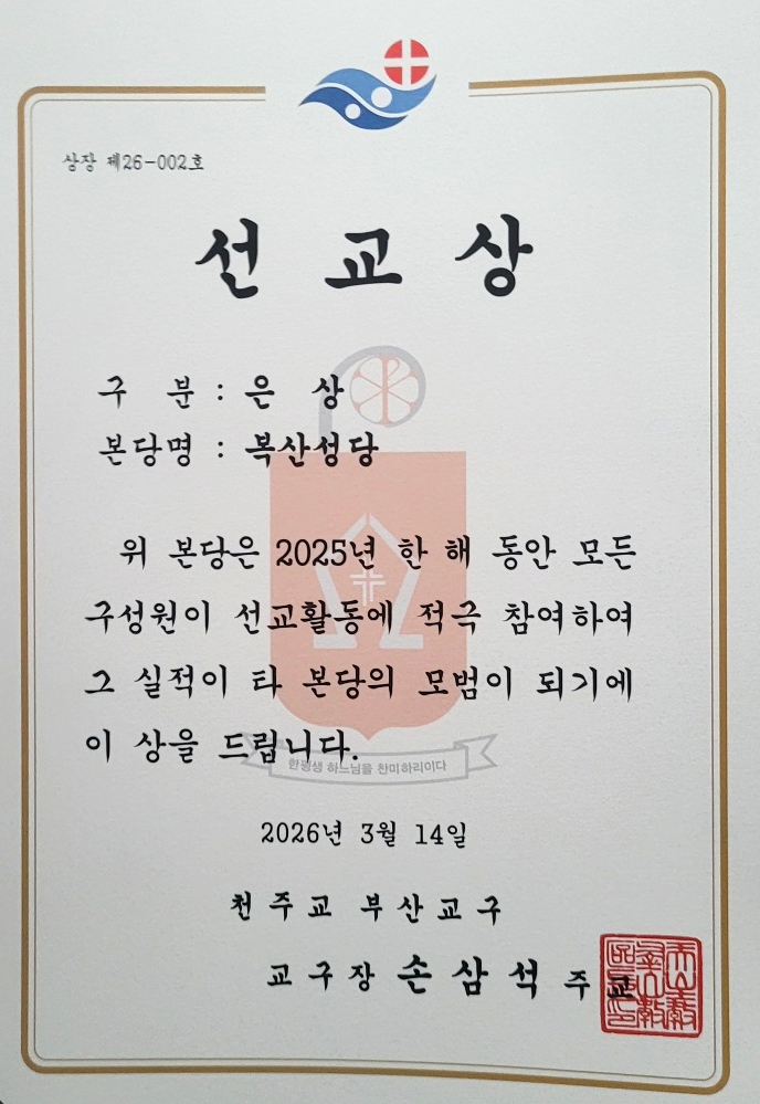 2026년 3월 14일(토) 부산교구 회장단 연수에서 복산성당이 2025년 부산교구 142개 본당 중 선교 우수 본당으로 선정되어 은상을 수상했습니다.